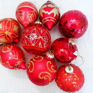9- piece Hand decorated glass Size from 3-4"" Red and gold Very shiny and glittery NEW , never used.