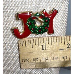 This festive enamel pin is designed with a vibrant red and green color scheme, featuring the word "Joy" integrated with a holiday wreath. Ideal for elevating your holiday attire or as a thoughtful gift, this pin offers a cheerful accent for the festive season.