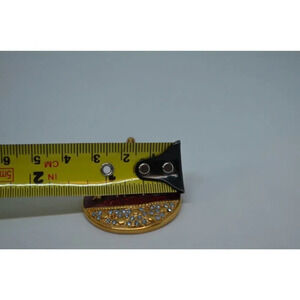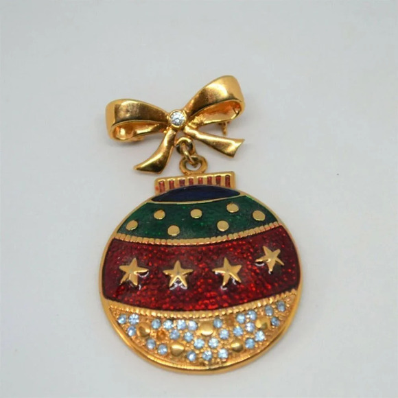 Vintage enamel Christmas ornament brooch on gold tone metal. A lovely piece with the bauble hanging from a metal ribbon. About 2" tall. It looks like one rhinestone is missing but it's not that noticeable - I didn't see it until listing.