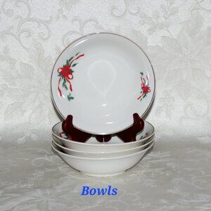 Vintage 20 piece Christmas dinnerware set, featuring a festive pattern of poinsettia flowers with red ribbons, on holly leaves with red berries.