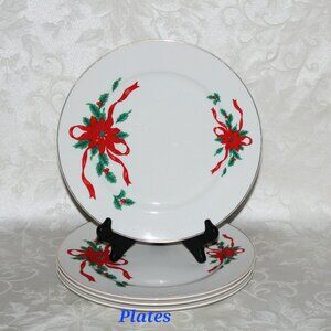Christmas Poinsettia Dinnerware Set | Holly Berries & Red Ribbon