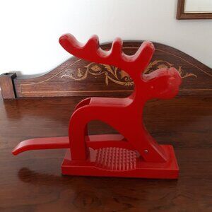 Extremely cute Reindeer Nutcracker in Red. Has a rubber bottom so as not to scratch your table surface. Quite heavy and well made. Measures approx. 6 1/2 inches tall, 8 inches long and 1 7/8 inches wide.