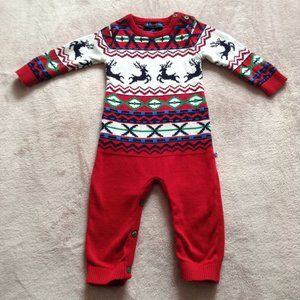 - Top half of the onesie has classic Fair Isle knit pattern in red, white, blue and green. The pattern features leaping reindeer, giving the outfit a festive look. Same pattern on front and back.
