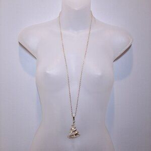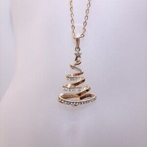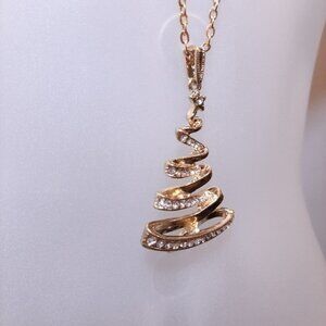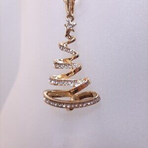 Christmas Tree Gold Tone Necklace Spiral Rhinestones Star Long Chain Holiday