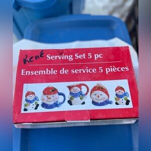 Large snowman cookie jar from home living a salt pepper crm sugar and napkin holder sent and a counter top spoon rest all come with boxes and are in good shape please love them as much as my grandma did when i bought them for her years ago I would love for them to live a long happy life as they did with our family now it’s time to let them move on