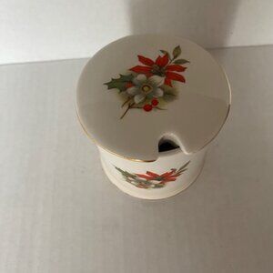 Christmas lidded Pot. Can be used as Jam, preserves or sugar bowl. Sadler England. Vintage. Poinsettia with Holly Berries. Some staining on the inside but it is just discolouring of the glaze. Great addition to your holiday table.