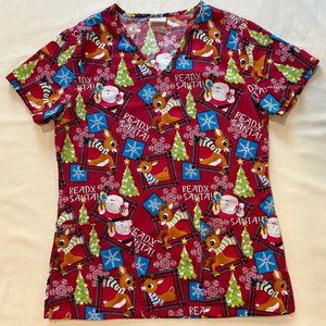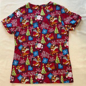 Rudolph the Red Nosed Reindeer scrub top. Worn only minimally and in excellent condition. Interior tag is quite worn from when top washed and so size no longer legible, but is size small. Heavy weight cotton. Two front pockets. Red background colour.
