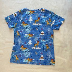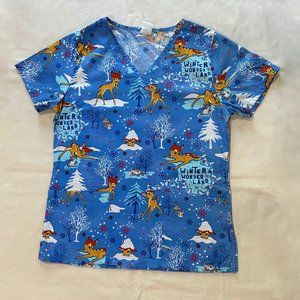 Bambie Christmas scrub top. Worn only minimally and in excellent condition. Interior tag is quite worn from when top washed and so size no longer legible, but is size small. Heavy weight cotton. Two front pockets. Blue background colour.
