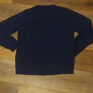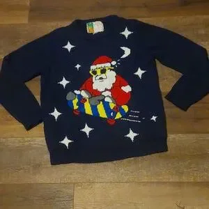 Navy blue knit sweater with skateboarding Santa Claus graphic