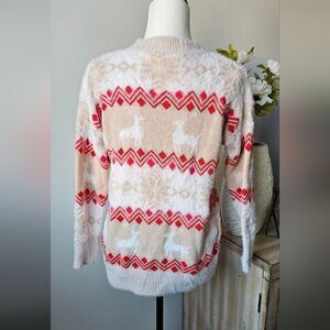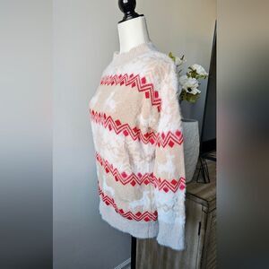 reindeer, snowflake, red design, fuzzy warm cozy sweater, super soft, slight mock neck, size small, good condition, worn once, Christmas holiday sweater, ugly Xmas sweater party, winter