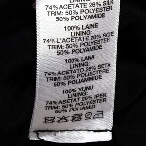 Composition: 100% wool; lining: 74% acetate, 26% silk trim, 50% polyester, 50% polyamide