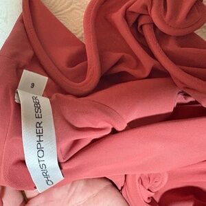 Christopher Esber molded Venus dress in size AUS6 (on label)/US2. Worn twice. Small separation in the seam of the zipper as shown, easily reparable. Nylon/viscose blend.