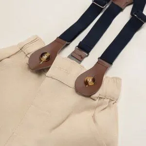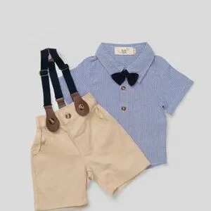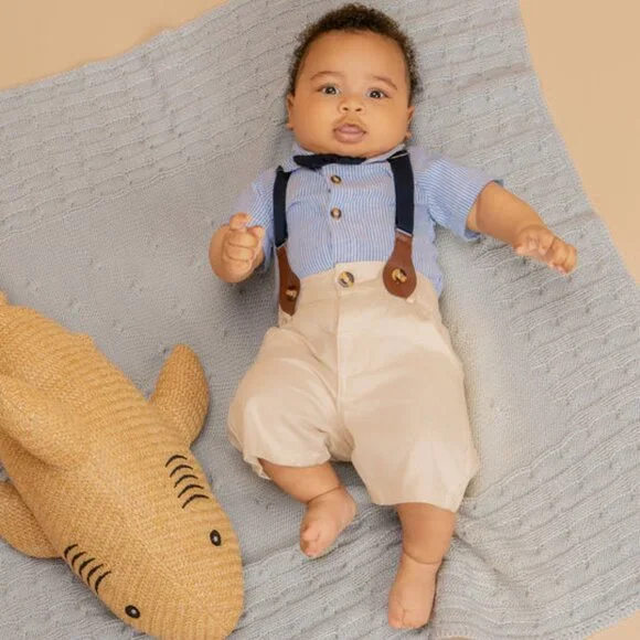 For the little gent with timeless charm, the Château Chic Set is where classic style meets modern comfort. Featuring a soft pinstriped shirt with a crisp collar, adjustable suspenders, a tailored bow tie, and structured shorts, this outfit is made for picture-perfect moments and dashing entrances. Crafted from a breathable blend of 95% cotton and 5% spandex, this ensemble allows for all-day comfort and movement while keeping your little one looking sharp. Whether it’s a wedding, birthday, or family celebration, this look brings elegance without compromising on ease.
