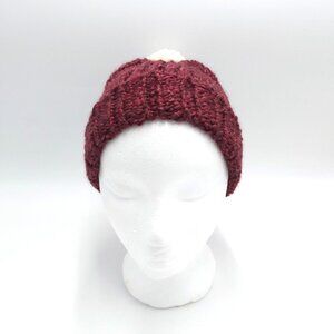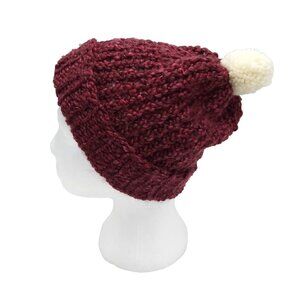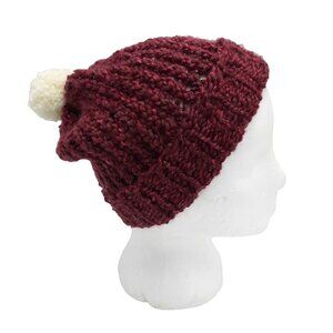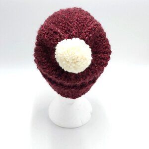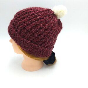 Chunky Beanie Slouch Hat Toque Cream Pompom S-M Dark Burgundy Handmade Loom Knit