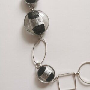 Features big beads made of lucite with silver and black ink on the inside. The links on the necklace are large ovals, circles and squares for more visual interest.