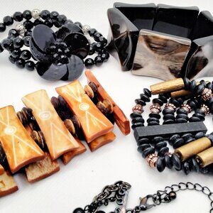 Straight out of the 1980s or 90s, this is a mixed lot of five chunky bracelets - all preowned. There are three black, one navy and gold, and one light brown wood and beads. Four are cuff style with elastic thread, while the fifth has a clasp. There are no maker/manufacturer markings on them