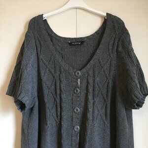Good preowned condition, chunky cableknit, dark grey, short sleeve, button down cardigan sweater by MXM. A hug of warmth for those chillier months. There's some reinforcement where the buttons have been sewn in to prevent warping and stretch. A versatile piece that compliments any look; cottagecore, prairie, academia, bohemian, wiccan etc.