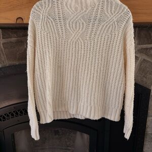 Stay cozy and stylish in this chunky cable knit sweater featuring a small turtleneck for added warmth without the bulk. The classic cable knit pattern adds timeless texture, while the relaxed fit makes it perfect for layering over jeans or leggings for an effortless, cozy look.
