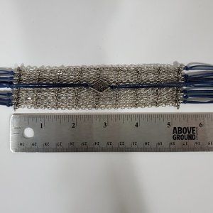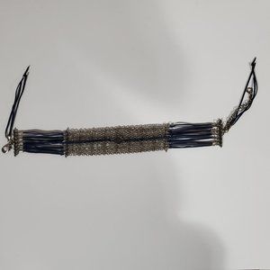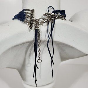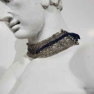 Chunky silver chainmail choker necklace with navy impression suede ties and detailing.