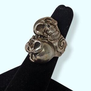 This ring is made of a silver tone metal and has a fixed-size band. The ring itself is quite chunky and has a decent weight to it. The front of the ring features two screaming skulls, one facing either direction. There are a lot of small details in the faces with tone darkening in the little pits and crevices. The ring has wear throughout, most visible as tone darkening/tone loss. A polish would likely restore a lot of the shine to the piece, but the patina is also nice.