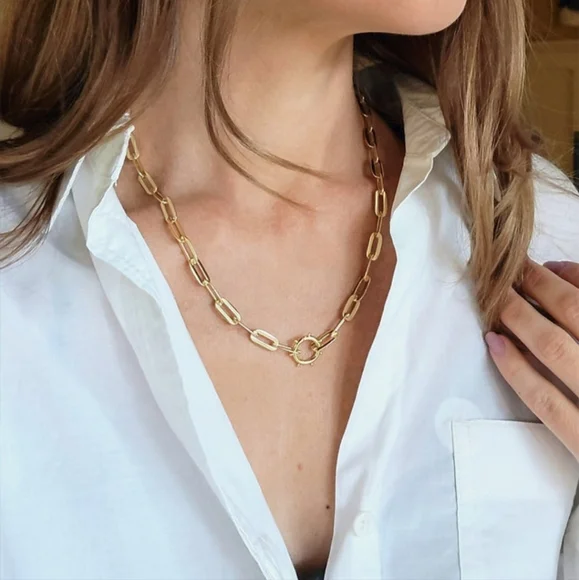 This gorgeous glossy gold chain is the perfect size thickness for a modern everyday look. Clasp this however you feel, a choker style, or standard chain, add a charm onto the clasp for a completely different look. This chunkier weight looks great over sweatshirts and knits.