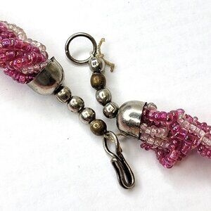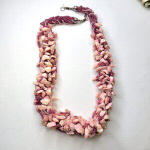Multistrands of pink beads are intertwined and braided with pink and pinkish white irregularly shaped shell chips to form this beautiful chunky necklace