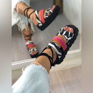 Chunky Platform Mixed Media Sandals With Tie Up Cow Print and Pink Size 8. Super cute animal print and pink and orange with zipper detail. Tie up the ankle or tie can be removed and just worn as slip ons. No brand. Made in Brazil. US size 8. Excellent condition.