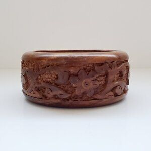 Chunky Tribal Style Hand Carved Wide Wood Bangle Bracelet Floral Vines Texture