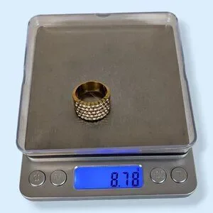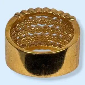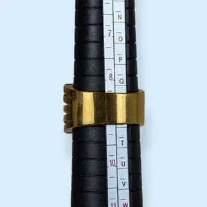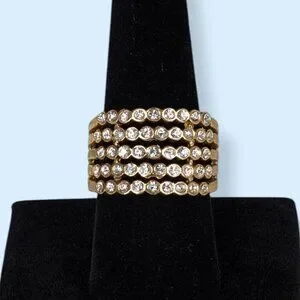This chunky ring is made of a gold tone metal and has a thick, fixed-size band. The front of the ring has 5 rows of small white/clear rhinestones in round "frames", with the space between them cut out. The ring has normal wear, including superficial marks in the surface of the metal and a little bit of tone loss in some areas of the band. There are no missing or broken rhinestones.