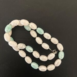 Chunky, clasping costume necklace in white and pale blue. Can be worn in a single layer or wrapped as shown. May be worn as a bracelet depending on wrist size.