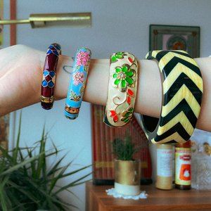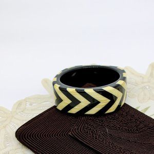 This chunky square bangle has a great contrasting wood grain and black chevron pattern. Quite lightweight despite the size.