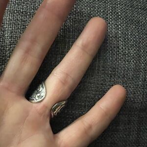 This is such a great statement ring in silver and oxidized silver tone metal. There are no markings on the ring therefore the metal is unknown.