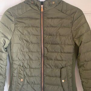 CiSONO Los Angeles outerwear women's spring/fall zip up puffer jacket. Army green with stylish gold zipper. Size small, fits as extra small, however the elastic on the sides will stretch slightly to fit perfectly. Worn once.
