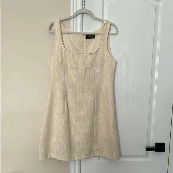 Elegant cream mini dress by Cider. Features a sleeveless design with a subtle texture. Perfect for casual outings or special occasions.