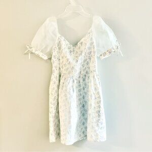 Stunning Love and Fantasy mini dress from Cider. Features a sweetheart neckline, corset style waist, and sheer, puff style short sleeves with little bows attached to them, complete with little blue/purple pastel flowers. Size is unknown; please see measurements below.
