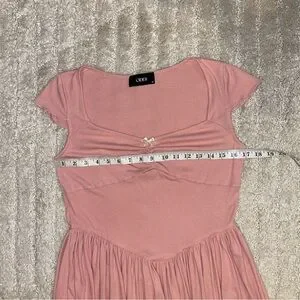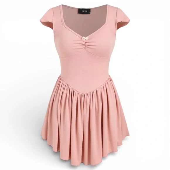Cider pink ruched bowknot mini dress with cap sleeves and sweetheart. Size medium (US 6) measuring approximately 17" ptp when laid flat. New without tags, tried on but never worn.