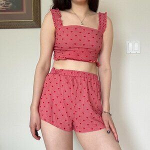 cider red heart print crop top and shorts matching set. zipper at side of top.