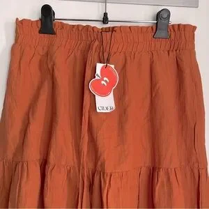 Lightweight tiered maxi skirt by Cider. Elastic waist for comfort. Flowing A-line silhouette. Solid rust orange hue. Simple, versatile design. Runs very slightly small.