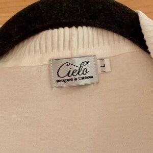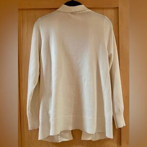 Elegant cream cardigan with ribbed collar. Ideal for layering.