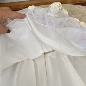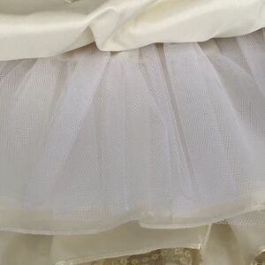 Adorable party dress for your little princess! Sleeveless, lined classy ivory and gold thread. It’s in excellent overall condition but see last photo for small mark (I have not tried to remove it), it’s barely visible.