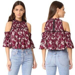 The Soha Top in Berry Multi by Cinq a Sept from Revolve. Size Medium. A floral Cinq a Sept top styled with shoulder cutouts and smocking. Raw ruffles trim the collar. Long sleeves with flared cuffs. Hidden back zip. 100% silk. Dry clean only. Exposed back zipper closure. Elasticized smocked top and sleeves. Ruffled raw cut neckline. Shoulder cut-outs. Manufacturer Style No. ZW182 396Z. Excellent pre-loved condition. No flaws.