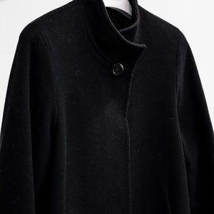 A black wool coat from Cinzia Rocca featuring a concealed 4-button front closure, a classic collar, slightly padded shoulders, double jacket vents, and a viscose lined interior.