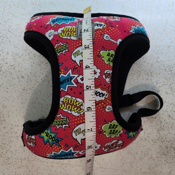 RC Pets- Circue Comic Sounds Pink & Black Dog Harness. Size large, please see chart. Poly/Nylon/Spandex. NWOT. 9.25 inches front to back(Harness itself), 8.5 inches wide aprox side to side(harness itself)-not including straps. 30-40 pound dog with a chest girth(not diameter) of 18-24 inches aprox.