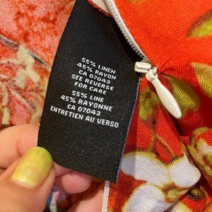 Very feminine, very estival; very summer like! Fresh and light to put on. It's great to walk, great for a piknik and amazing for a dance. Its' easy to wear with a t-shirt and running shoes or with a blouse and hight heels. It's a large circular skirt (50'' wide), it's linen printed with floral pattern on a bright orange background. It has side pocket on each side, it has a small zipper on one side of the waist. It's 27'' long. The interior finish is perfect but there is no lining. Waist: 28".