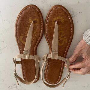 Circus by Sam Edelman T Strap Neutral Patent Sandals Silver Hardware Tan Sz 11