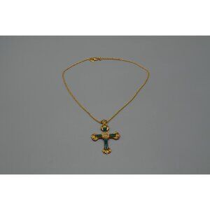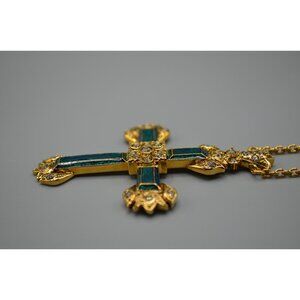 Ciro Thailand Gold Tone Cross Pendant Necklace w/ Green Inlay 19" Chain