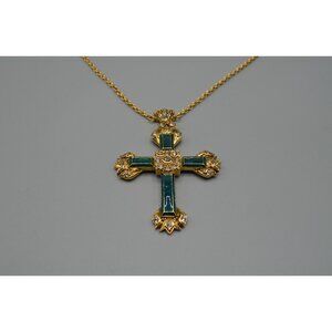 Ciro Thailand cross pendant on approx. 19" chain. Green stone inlay with clear stones in the center. Gold tone metal. Excellent condition as shown.