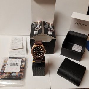 his is a citizen eco drive model with a rose gold-tone stainless steel case, and a sunburst brown dial, this watch has a date function, and large, lumed hour markers, with lumed daphne-style hands, as well as a fixed bezel made of aluminum with dive time markings on it.