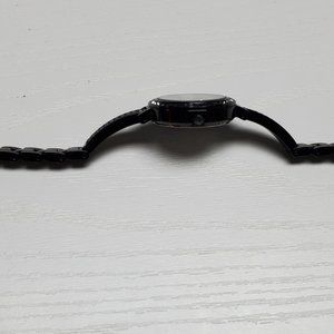 It features a black ion stainless-steel bracelet, black 25mm case and black dial, with subtle pink gold-tone accents.