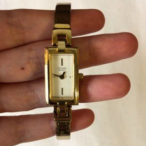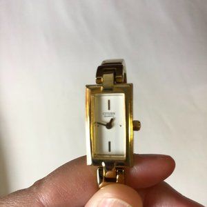This is a very pretty and feminine Citizen Quartz women's wrist watch. The metal is gold-tone. The watch has a fold over clasp that closes tightly.